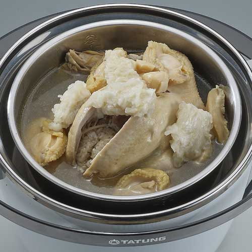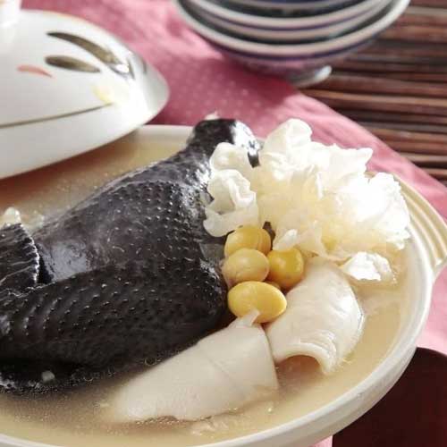 此湯品完全不加一滴水‚烏雞肚中塞入糯米、紅棗、枸杞、龍眼肉一起燉煮‚原汁原味‚圓潤鮮香。