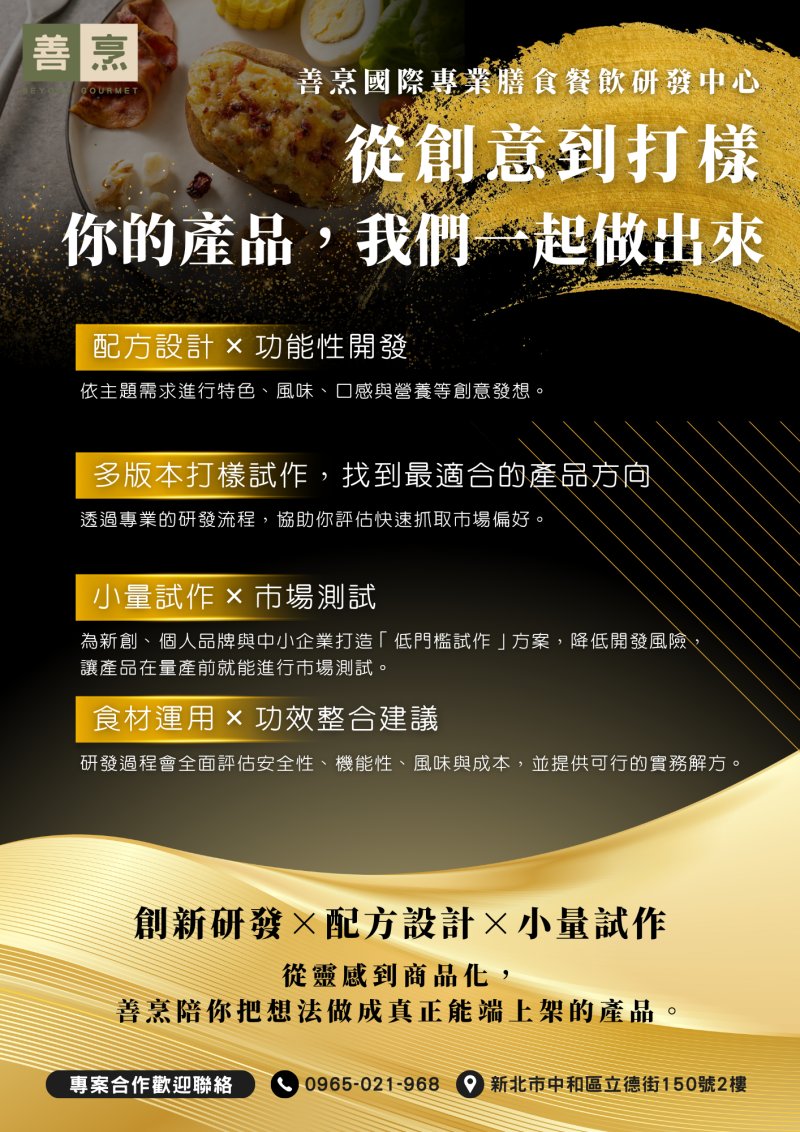 善烹以深厚的研發底蘊打造高彈性的產品配方,能依據品牌需求進行多元食品的創新設計。